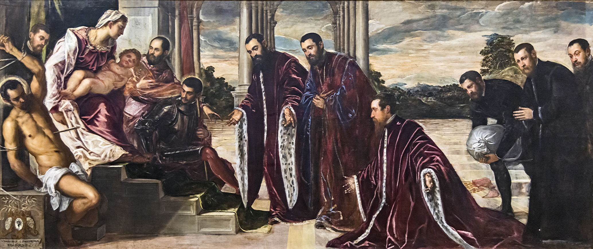 In the lower left corner are the three heraldic shields of the camerlenghi, together with the inscription Tres et unus unanimis concordiae simbolus, expressing the unanimity and concord of the three. Tintoretto’s ingenious composition strengthens that feeling with its measured repetition.