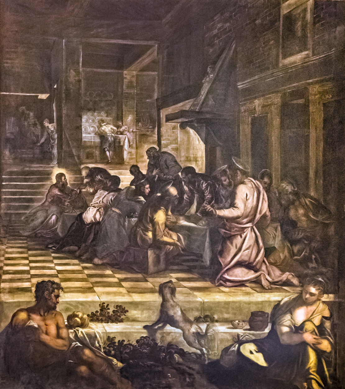 Although Jacopo was probably less involved in the painting of this Last Supper (E&I 229) than the works above, it was clearly developed along the lines of his series of Last Suppers, and is similarly relaxed and informal. Its cast includes his usual dog and servants, but there is no sign of any young boy climbing the steps on this occasion. The setting appears distinctly Venetian, and Christ is identified as sitting at the far end of the table, to the left.