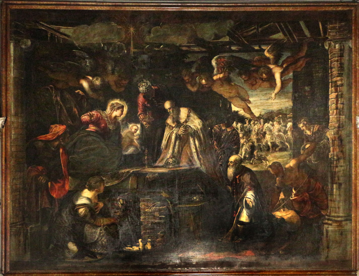 The Adoration of the Magi (E&I 263) (1581-82) continues the theme of decaying brickwork and collapsed rooves. Although the three Magi are still in their finery, Tintoretto has kept their train of courtiers, horses, and riches well in the right distance, framed by the large barn doorway. This refers to some pictorial elements in the Adoration which he had already painted for the Sala superiore, but remains visually distinct.