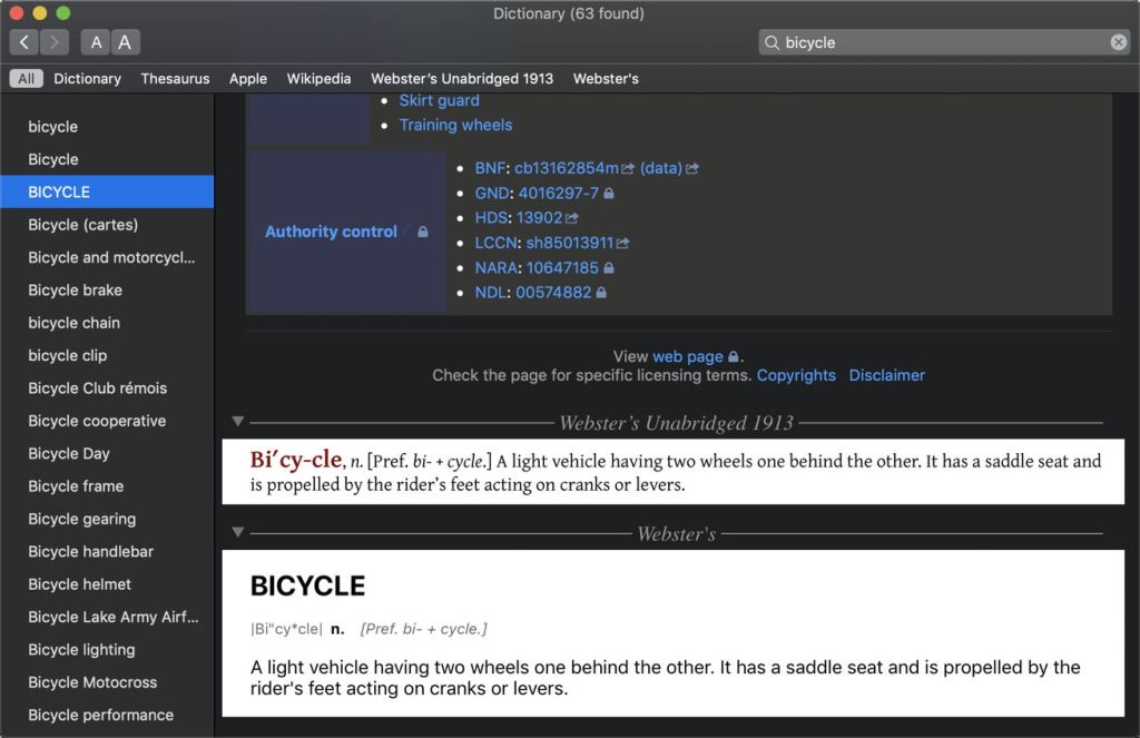 The one app which has become a bit of a mess is Dictionary. Because its content can be drawn from several different types of source, Apple has tried to make this more uniform: its rendering of Wikipedia pages has been carefully translated into Dark Mode. And it works rather well too.
