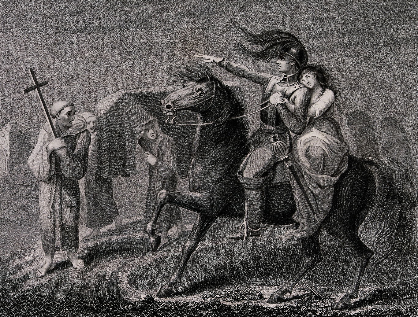 A second translation published that same year by William Robert Spencer featured engravings by Edward Harding of a series of paintings made by Lady Diana Beauclerk. This shows William in his armour, waiting for Lenore to join him on his horse.