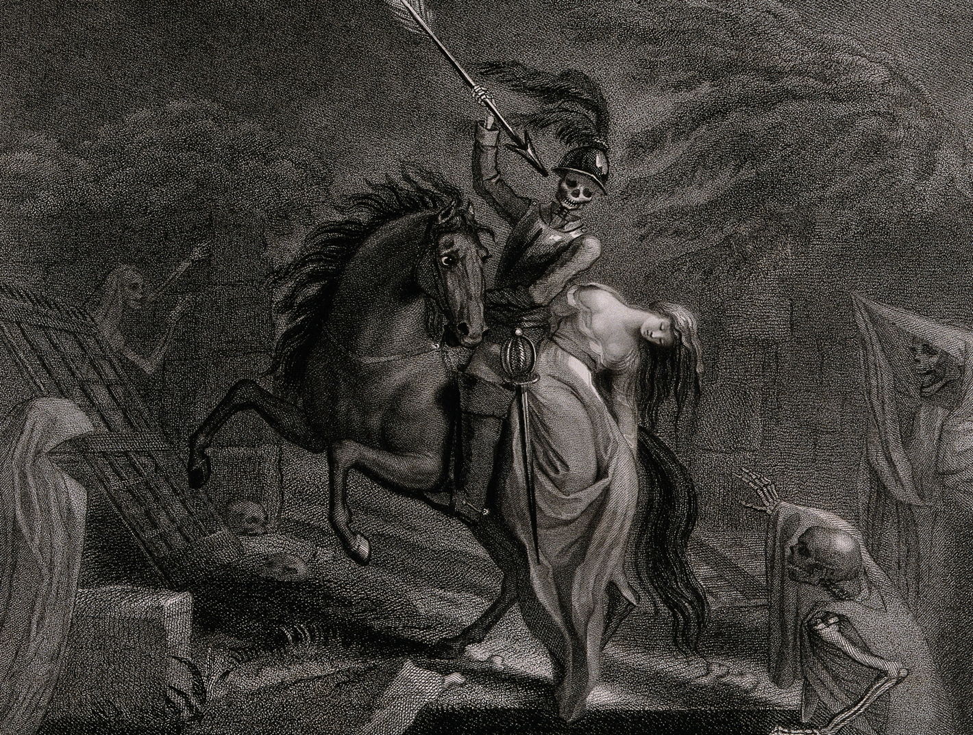 Horace Vernet, in The Ballad of Lenore, or The Dead Travel Fast from 1839, shows William transforming into the figure of Death, as the horse crosses tombs in the graveyard.