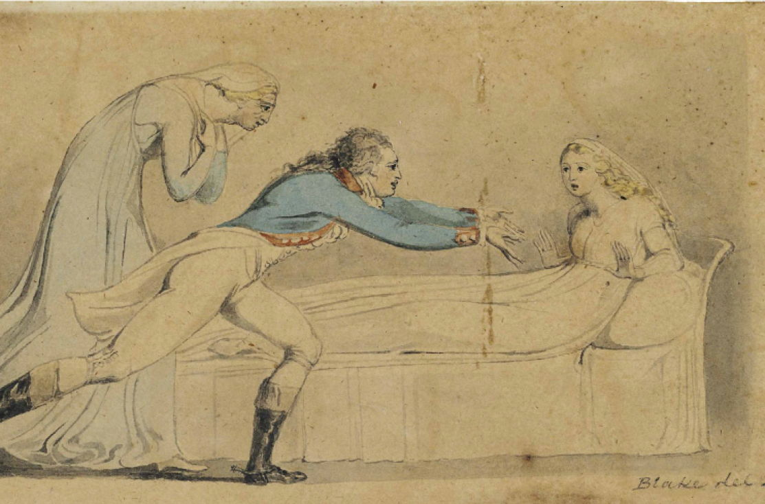 Three different translations of this ballad were published in Britain in 1796. One of them, a free adaption by J T Stanley, was illustrated by the great William Blake. This is probably an original watercolour of his for one of the plates, showing William inviting Lenore to accompany him out to his horse, as her mother looks on in concern.