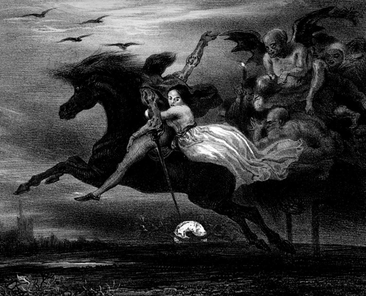 This monochrome image shows what I believe is a full-colour painting by Louis Boulanger from 1832, which I think has been titled incorrectly as Witch’s Sabbath, but clearly shows William and Lenore being pursued by winged daemons.
