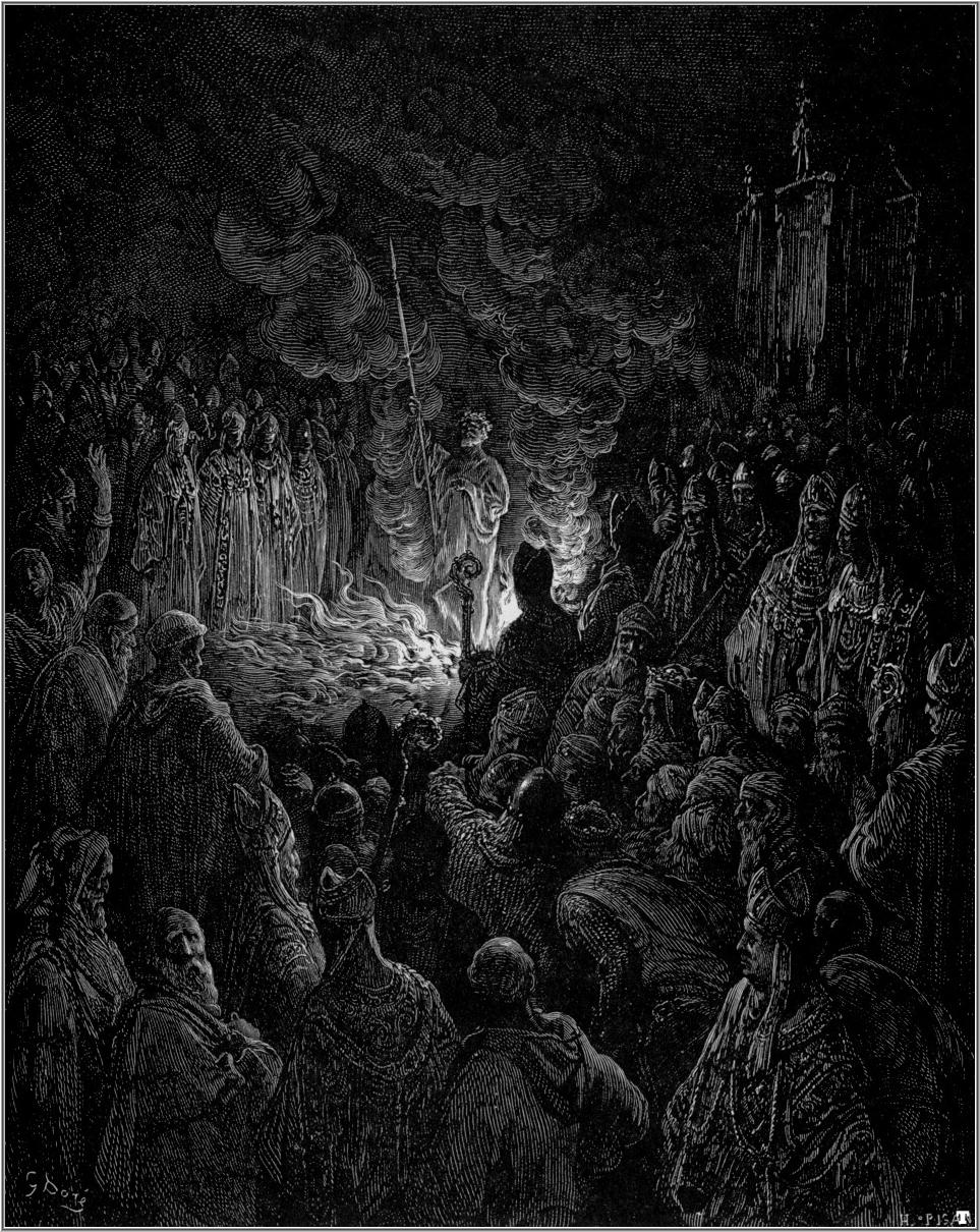 On the march, the mystic Peter Bartholomew (or Barthelemy), who had discovered the Holy Lance in Antioch, continues to have visions. Faced with growing scepticism from others, he volunteers to undergo ordeal by fire to prove his veracity. Gustave Doré captures this dramatic event in his Peter Barthelemy Undergoing Ordeal by Fire. Although it is initially claimed that he survives the ordeal unscathed, he dies less than two weeks later from severe burns.