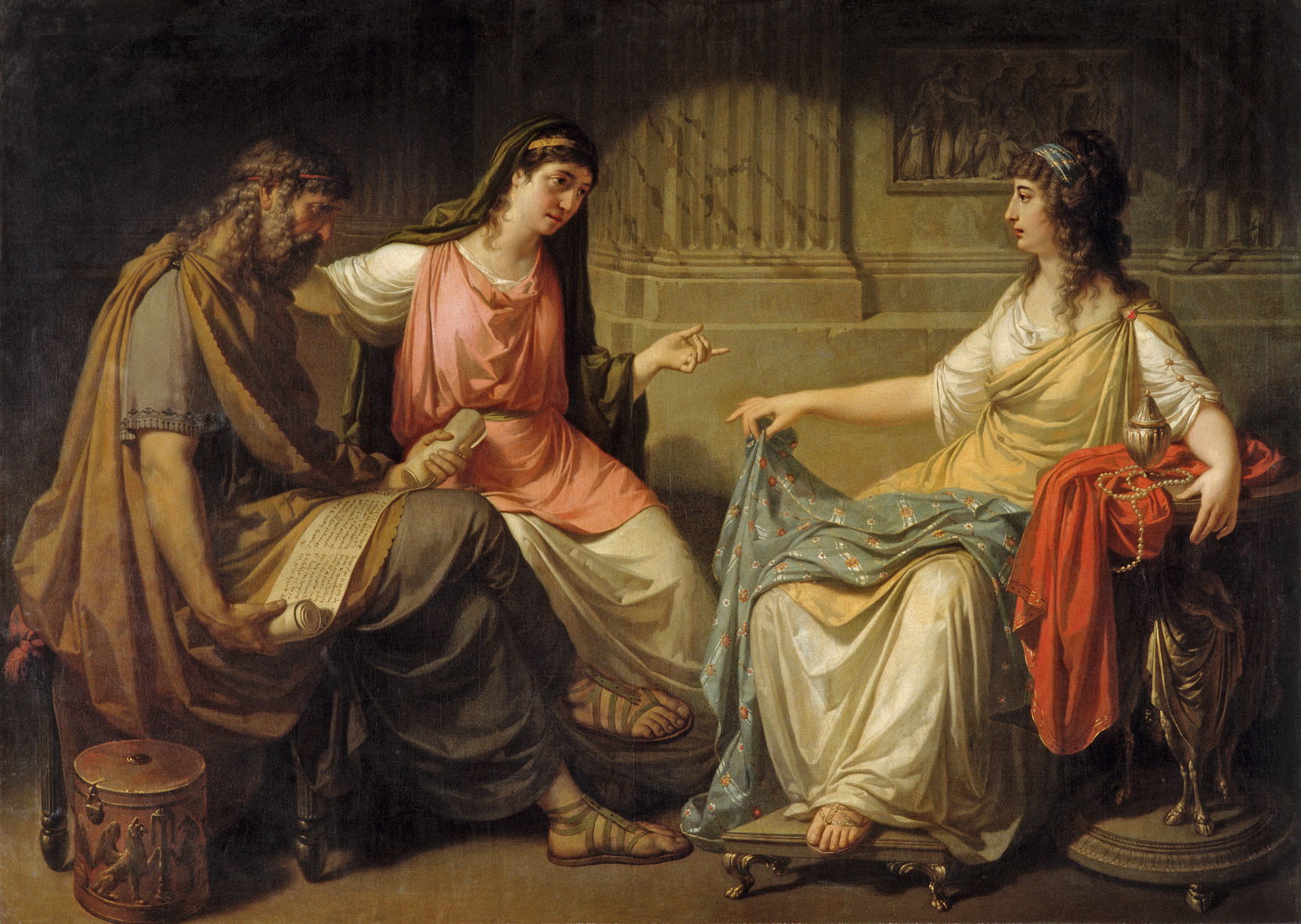 Franz Caucig (Franc Kavčič) (1755–1828), Phocion with his Wife and a Rich Woman (date not known), oil on canvas, 173.5 x 241 cm, Akademie der bildenden Künste Wien, Vienna, Austria. Wikimedia Commons.