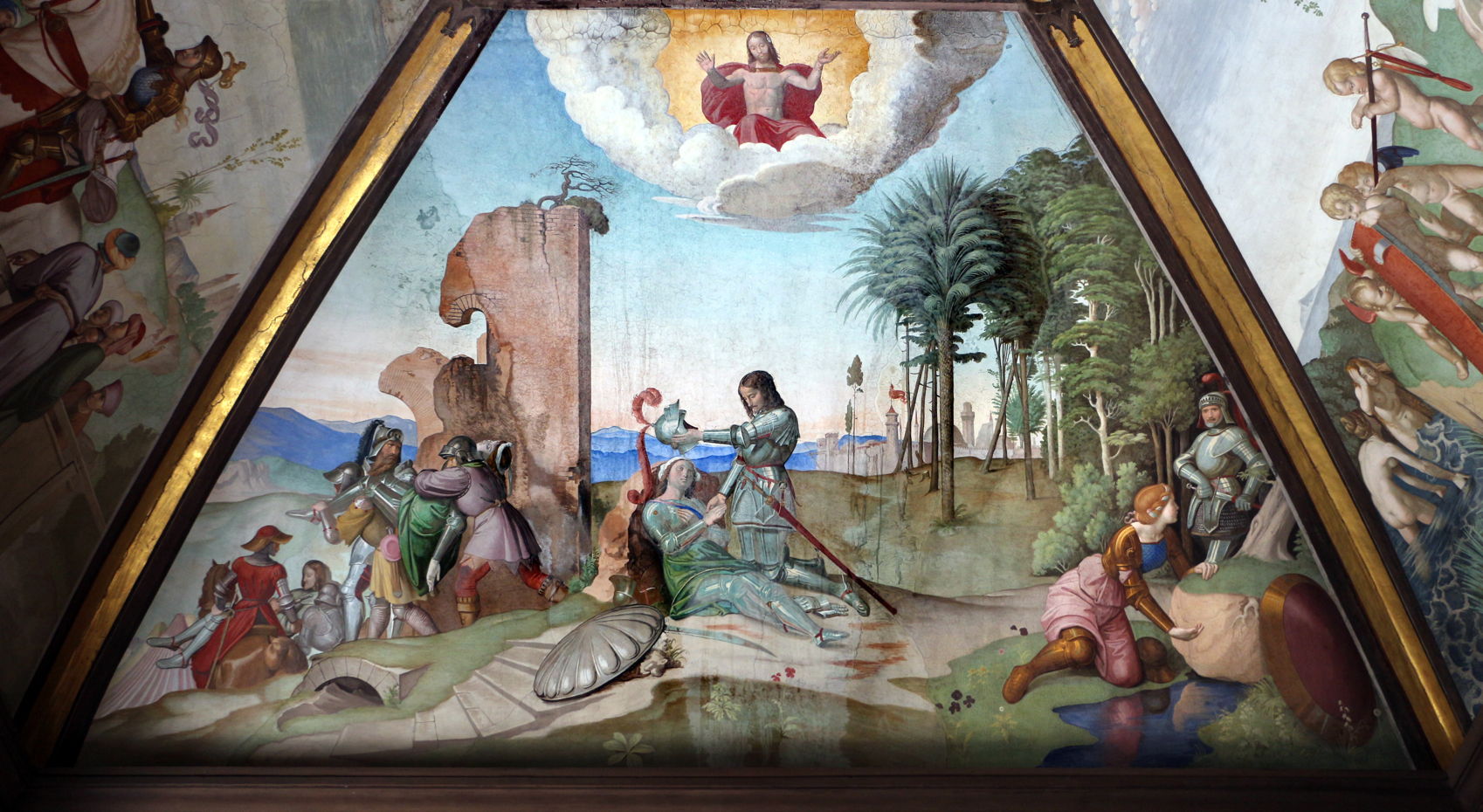 By far the most fascinating depiction, though, is that of Johann Friedrich Overbeck’s fresco in the Casa Massimo, Rome, which he painted between 1819-27. The section showing The Death of Clorinda features her baptism in the centre, and places the city of Jerusalem in the distance. It also includes two other scenes involving other characters from the epic, which I have yet to identify, and the unmistakable figure of Christ watching from heaven above.