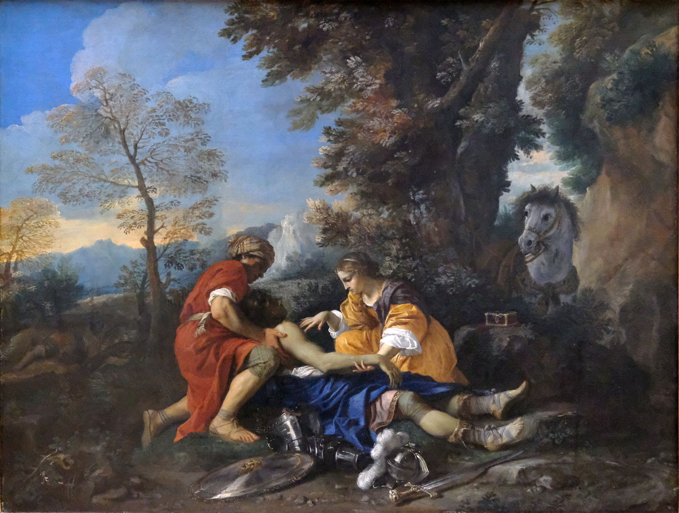 Pier Francesco Mola’s Erminia and Vafrine Tending the Wounded Tancred After the Battle with Argante from about 1650-60 shows a similar scene, with Vafrine cradling the knight’s head and upper body, and the body of Argante at the far left.