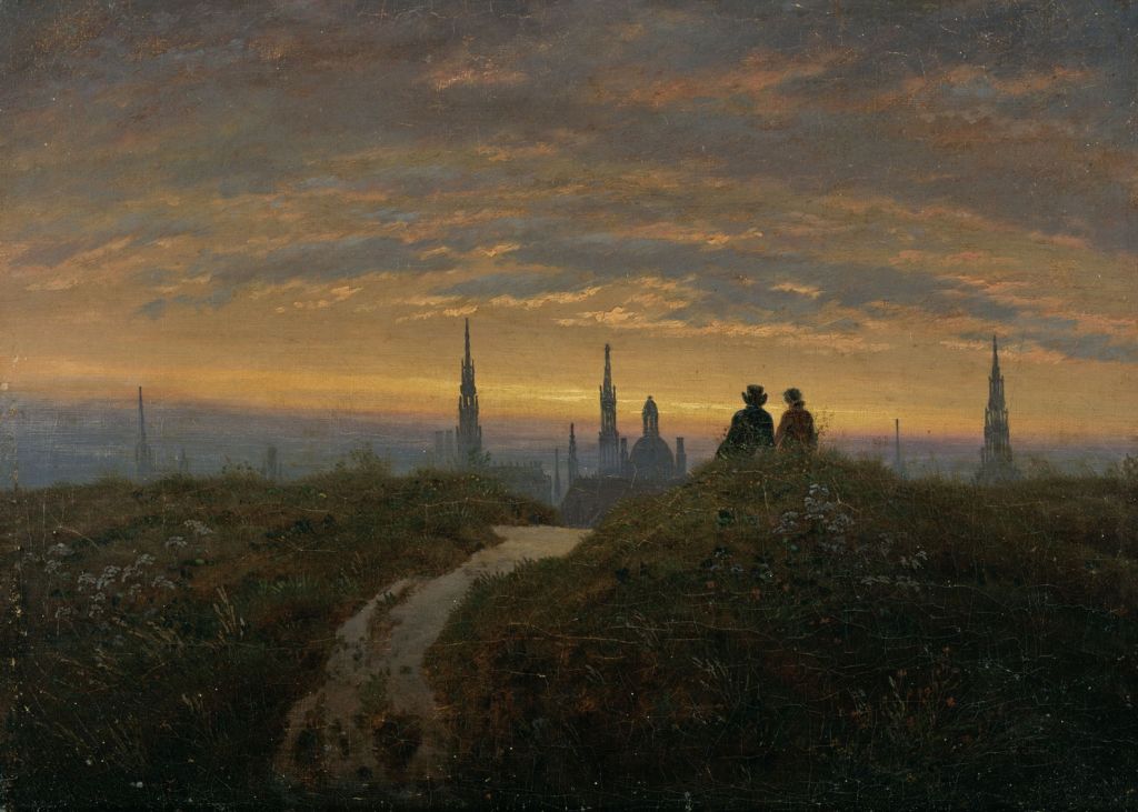 View of Dresden at Sunset from about 1822 is one of Carus’ finest paintings, with the famous spires and towers of the city of Dresden seen against the rich, warm light of dusk. Sat admiring the sight are two faceless figures, one wearing a distinctive top hat.