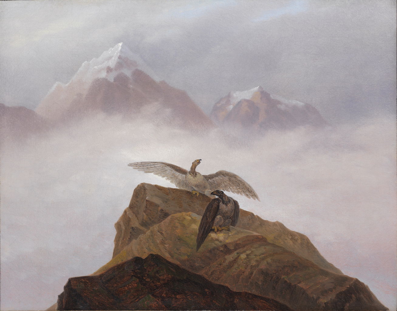 In Fantasy of the Alps. Eagles Nesting on an Alpine Peak (1822), Carus has developed his own distinctive version of the Gothic mountain and fog scene, in which the sole creatures are not human, but birds.