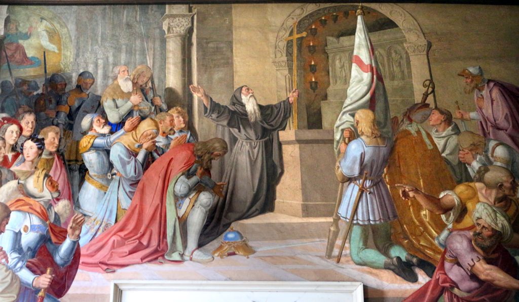 I’m not sure whether this scene of the Consecration of Godfrey (1819-27) in Overbeck’s fresco in the Casa Massimo, Rome, painted between 1819-27 is intended to show these closing moment in Tasso’s epic. Peter the Hermit stands holding the crucifix, as Godfrey, still wearing his armour, sinks on bended knee.
