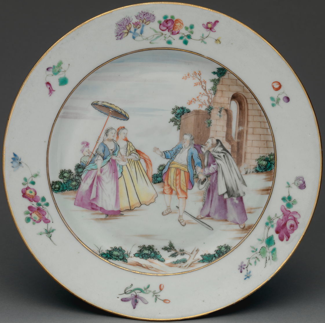 That became so popular that it was reproduced in prints, such as those by Nicolas de Larmessin (1684–1755) in which the image is naturally reversed, and here (not reversed) on a porcelain plate exported from China in 1745.
