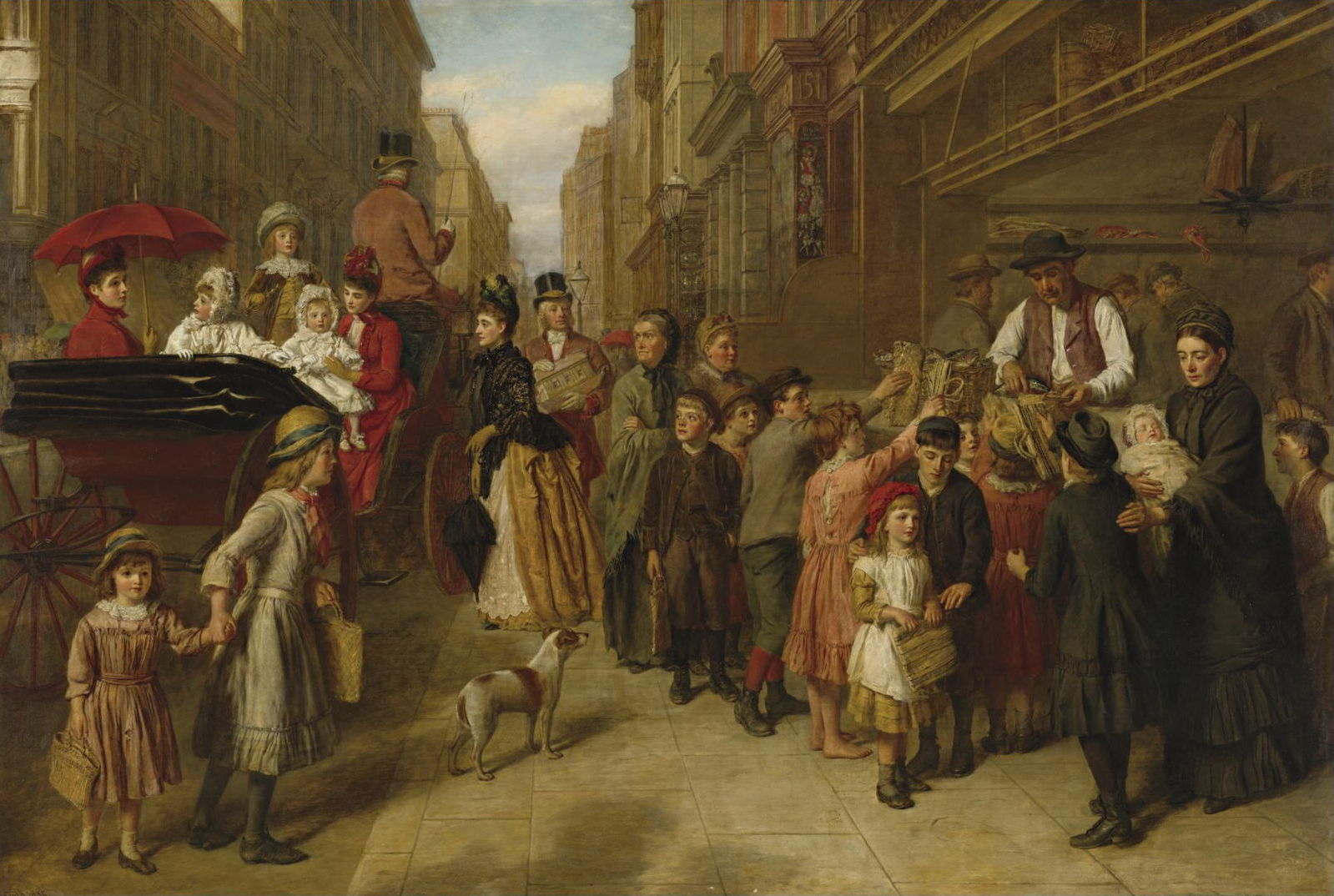 Towards the end of his career, Frith spent his time making copies of his earlier paintings, but Poverty and Wealth from 1888 is another Hogarthian view of late Victorian London. A wealthy family travel down the street in a fine carriage, as the poor at the right queue for cheap rotting fish at the fishmonger’s.
