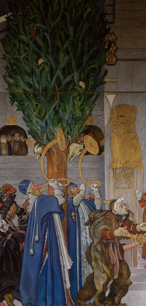Larsson’s last, and what he intended to be his greatest, mural for the National Museum was drawn from the mythical sagas of the Icelandic writer Snorri Sturluson, with additional material from Adam of Bremen. Larsson wanted it to form a contrast with the other murals which he had already painted.