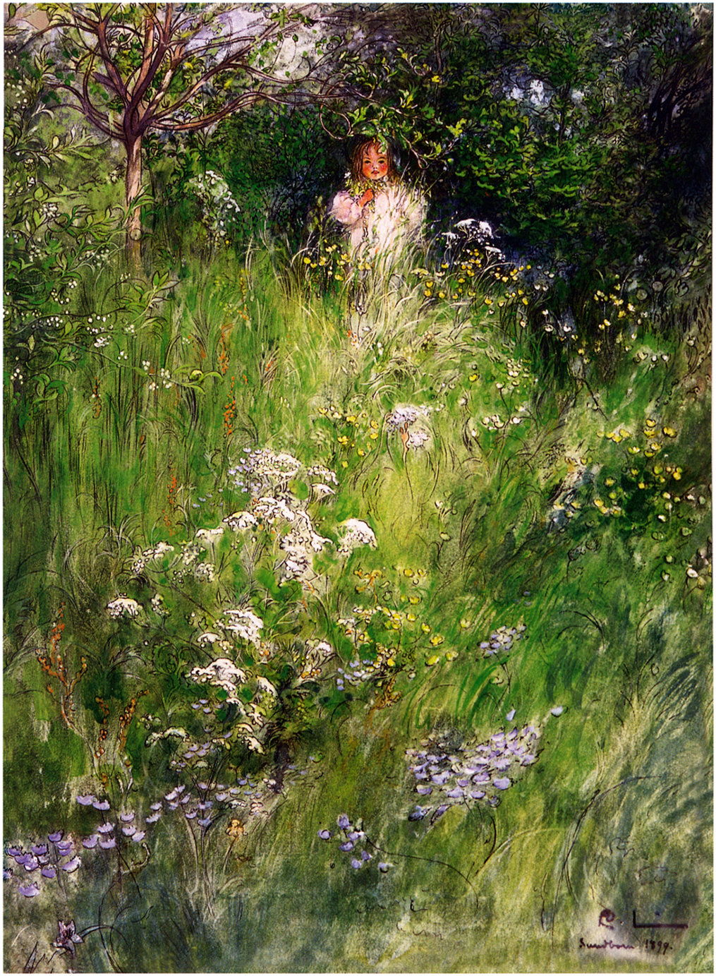 Larsson continued to paint more personal works which were not intended for reproduction in his books, including A Fairy (1899). This follows on from his earlier more Impressionist paintings, and again uses his favourite colour contrast of red against green.