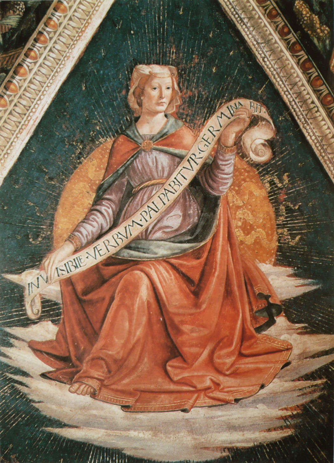Working in Florence, Domenico Ghirlandaio painted this fresco Sibyl Agrippa in the Sassetti Chapel in 1480. This is one of the first depictions in which the sibyl holds a scroll with prophetic words inscribed. She wears an ‘oriental’ headdress, and around her are mystical symbols.