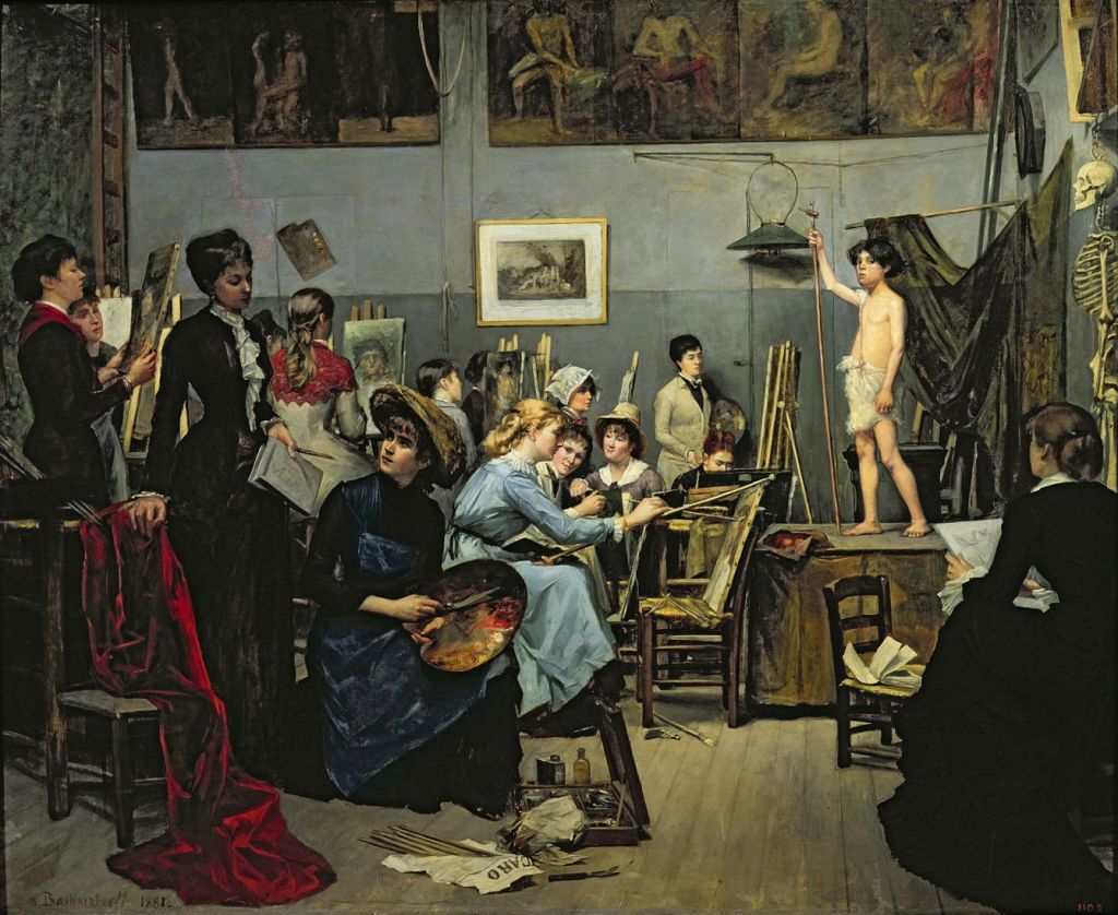 While Bashkirtseff was still studying at the Académie Julien, she painted In the Studio (1881), which gives the clearest insight into what her training was like. Her class was of course entirely female.