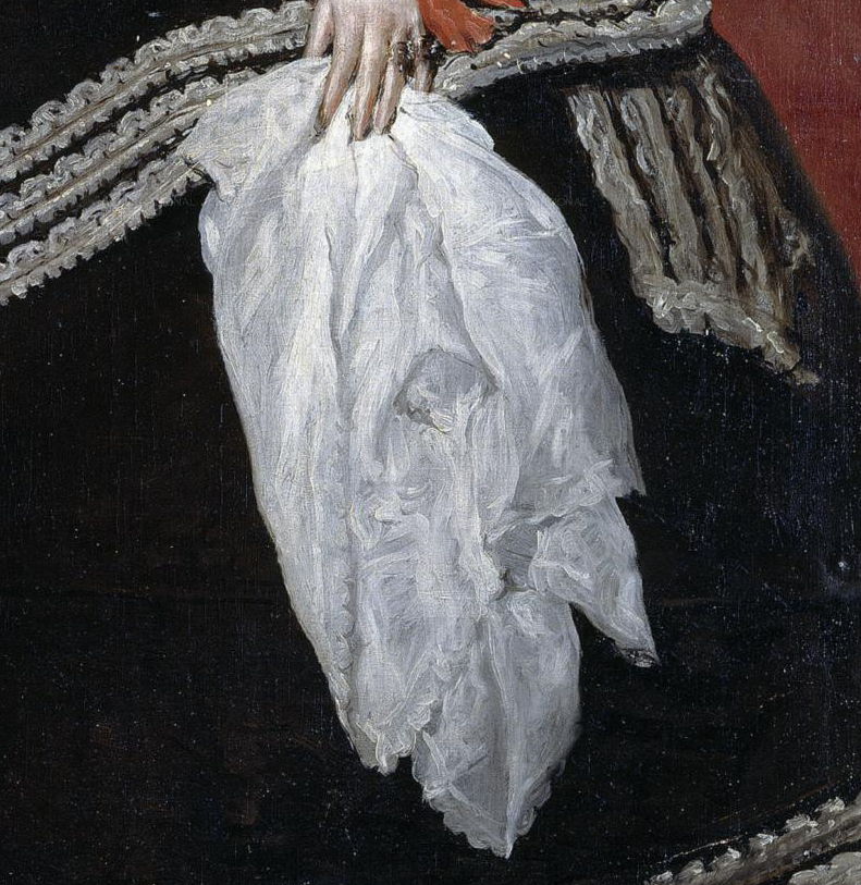The detail below shows how even in such a formal royal portrait, Velázquez’s brushwork had become extremely painterly. Despite this unfettered application of paint, the fabrics appear very lifelike – a skill as remarkable as that of Rembrandt.