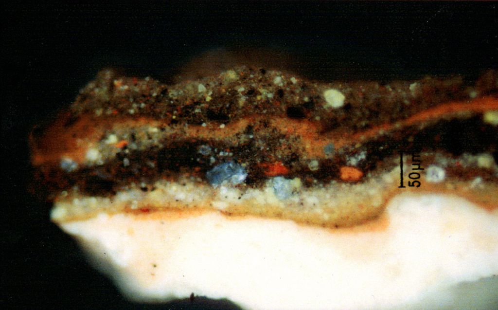 Not all paints contain pigments: some prefer soluble dyes instead. Generally dyes, which have often been derived from plants, aren’t as durable. Pigments consist of large insoluble particles, as seen in the cross-section above, which protects them from physical damage, chemical reactions, and most importantly the adverse effects of exposure to light, which can cause their intensity to fade.