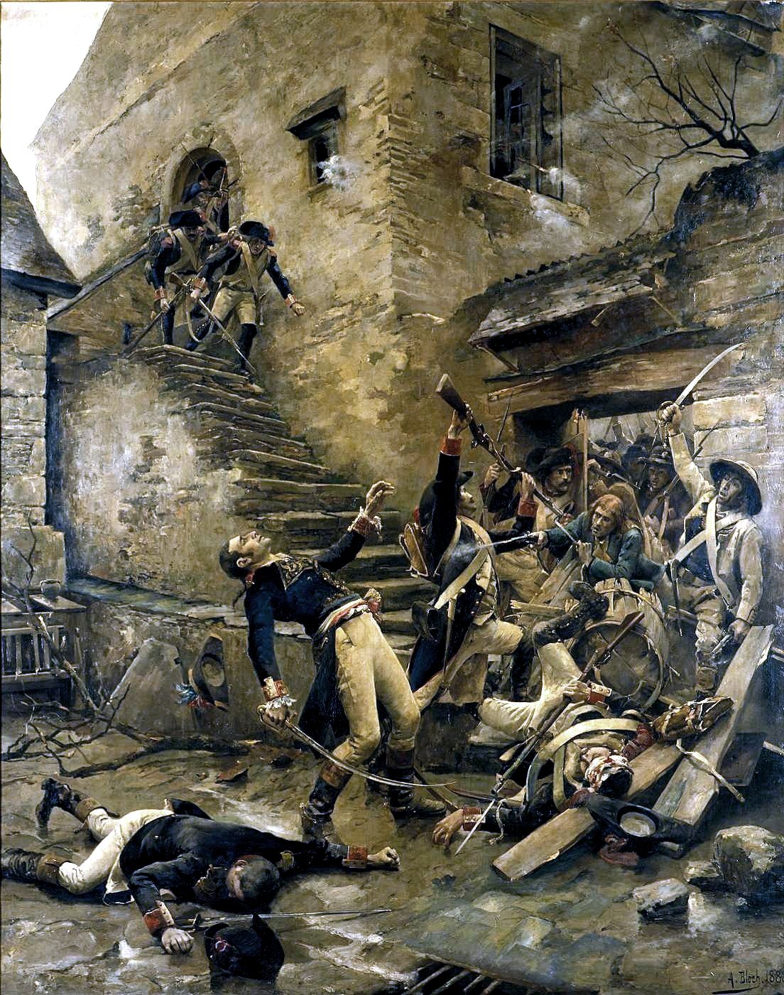 From the defeat at Cholet, remaining Royalist forces converged on Granville. On their way, they encountered Republican troops at Château-Gontier. In the course of brief action there, the Republican leader was killed, as shown in Alexandre Bloch’s painting of the Death of General Beaupuy at Château-Gontier, October 1793 from 1888. The troops in uniform on the left are Republicans, with the dying General in the lower centre, and Royalists to the right.