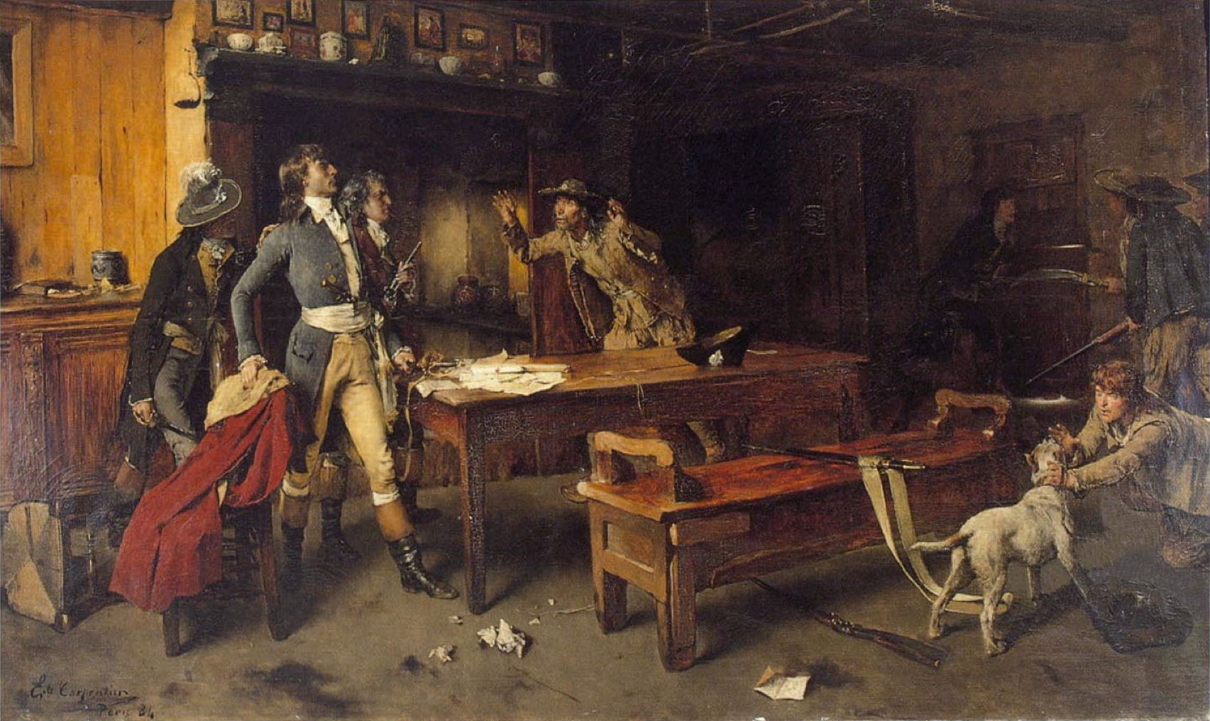 In the early 1880s, the anti-Republican artist Charles-Alexandre Coëssin de la Fosse painted several scenes from the civil war north of the River Loire, among which is this Episode of Chouannerie from 1883. Clues that these are Royalists are plentiful: the rosary and crucifix in the hands of the man in the foreground, their improvised arms, dress, and the fact that three are barefoot.