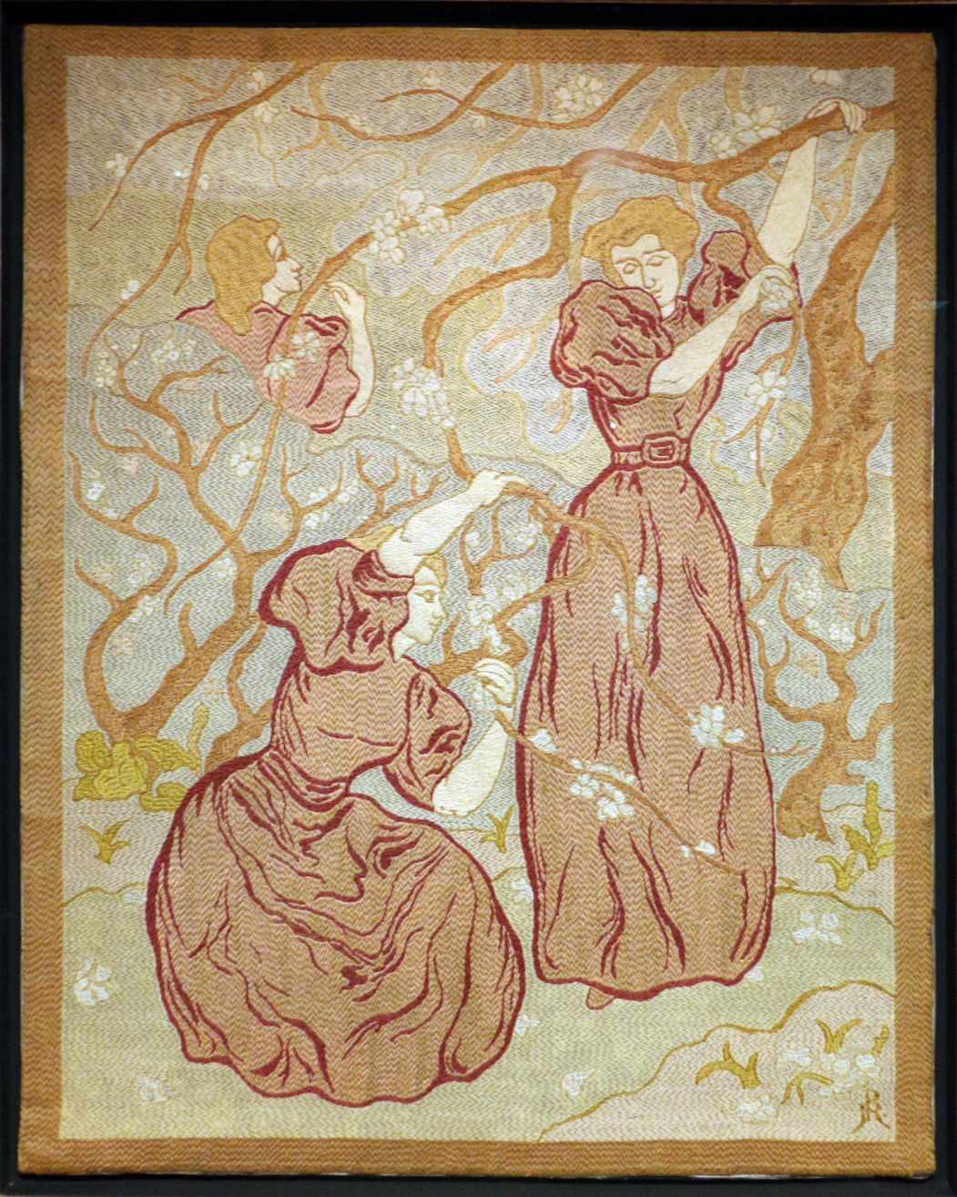 With his training in decorative arts, Ranson made designs for needlecraft and tapestry. Spring or Women Under Trees in Bloom is reminiscent of Maurice Denis’ earlier The Ladder in the Foliage (1892), but was made in 1895 in needlepoint. Its delicate textures reinforce its Nabi patterning.