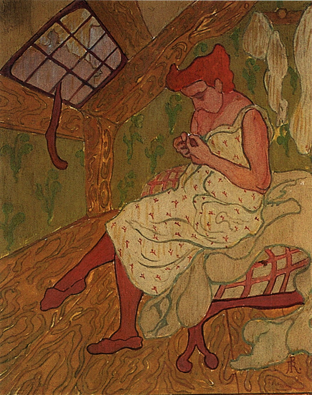 He still held to Nabi style in some works, such as this Sitting Woman from about 1898. She sits in a barren garret, a stocking dangling from the window, attending to her nails. Ranson has imposed fluid patterning on the bare floorboards and beams.