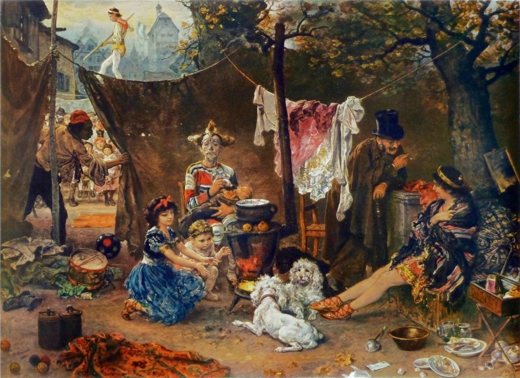 Ludwig Knaus shows the scene Behind the Curtain of a smaller itinerant show in 1880. Performers were often colourful in both their costume and character, with many incongruities – such as the clown seen in the centre feeding a baby, and looking straight at the viewer.