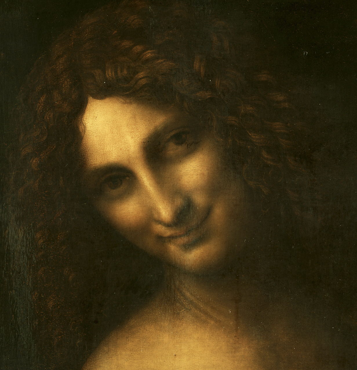Paul Barolsky has argued that it is based on the opening verses of the Gospel of Saint John (the apostle this time, of course) in which John the Baptist’s role as a witness to God’s light is expounded. The raised hand and serene smile, surely another reminder of the Mona Lisa, have become popularly quoted, although less known are the details obscured by its darkened varnish: the crucifix which parallels the raised index finger, and camel-skin robe cradled in his left arm.