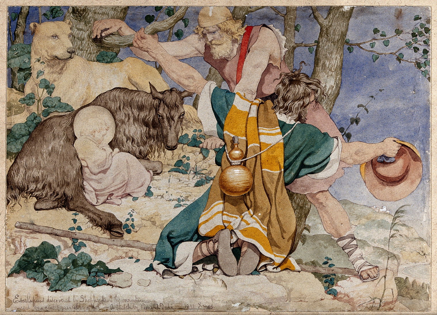 Richard Dadd’s unusual watercolour of The Infant Aesculapius Discovered by Shepherds on a Mountain (1851) shows a rare motif in visual art: the god of medicine Aesculapius as an infant being raised by a goat, with the help of a couple of shepherds. Dadd omits a snake which was an essential part of the story, as it accounts for the serpent which winds it way around the Aesculapian staff.