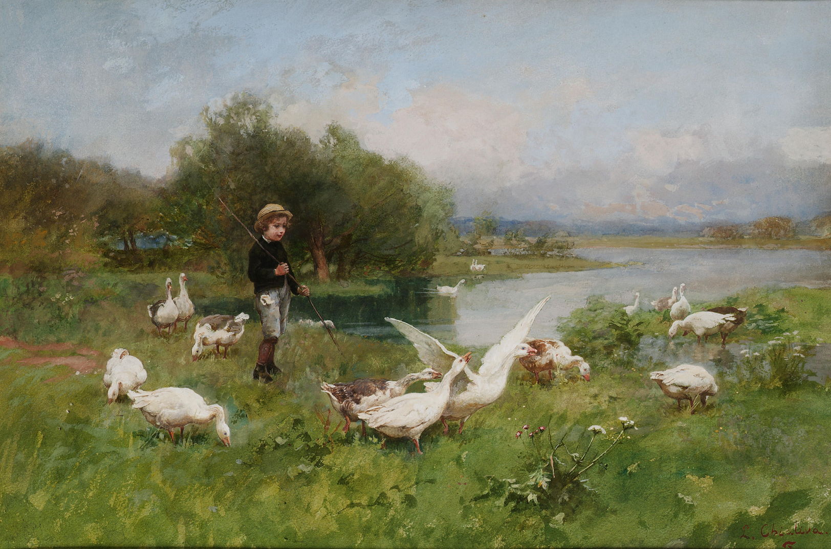 Luigi Chialiva is one of very few artists to have painted not a Goose Girl but a Young Boy Tending Geese, in this painterly watercolour.