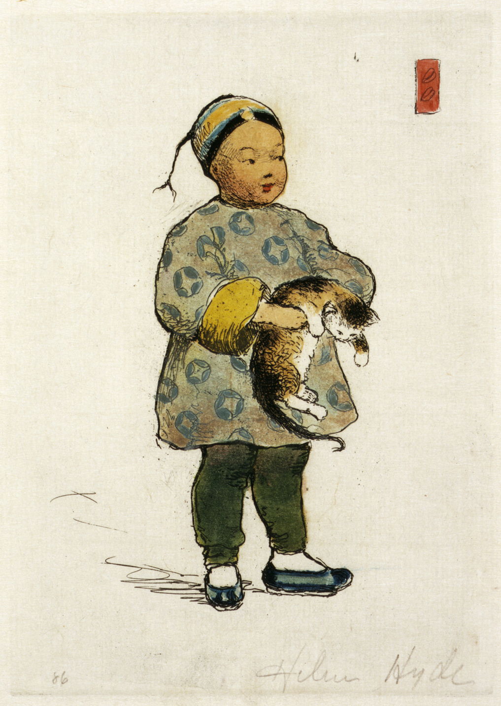 In 1897, Hyde made this delightful colour etching of The Cat and the Cherub, most probably from the sketches that she had been making in Chinatown.