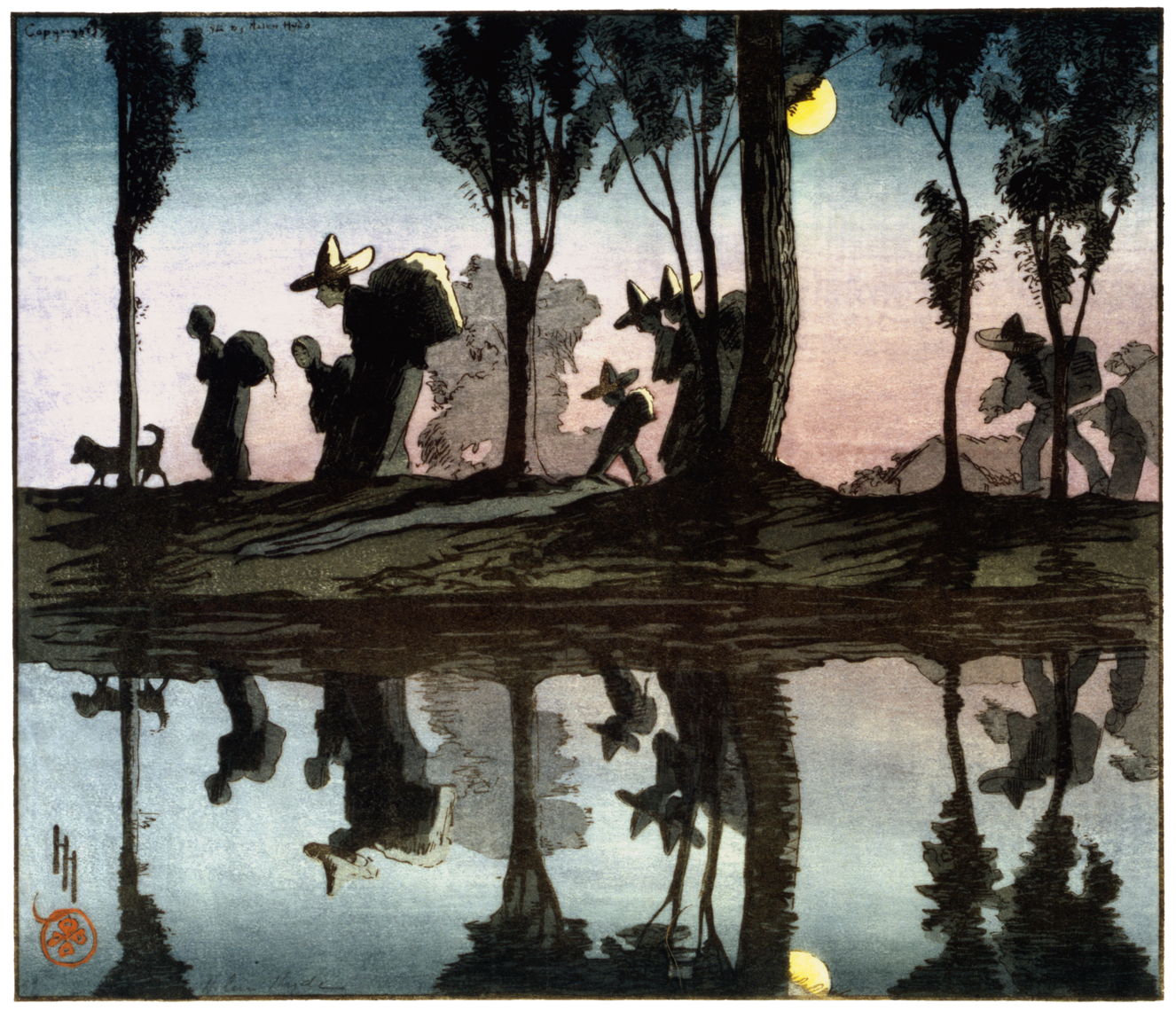 This unusual nocturne, a colour woodcut, showing Moonlight on the Viga Canal (1912) is based on her sketches of this canal, which runs from Mexico City to the suburb of Santa Anita. Although obviously Mexican, her Japonisme has even extended here.