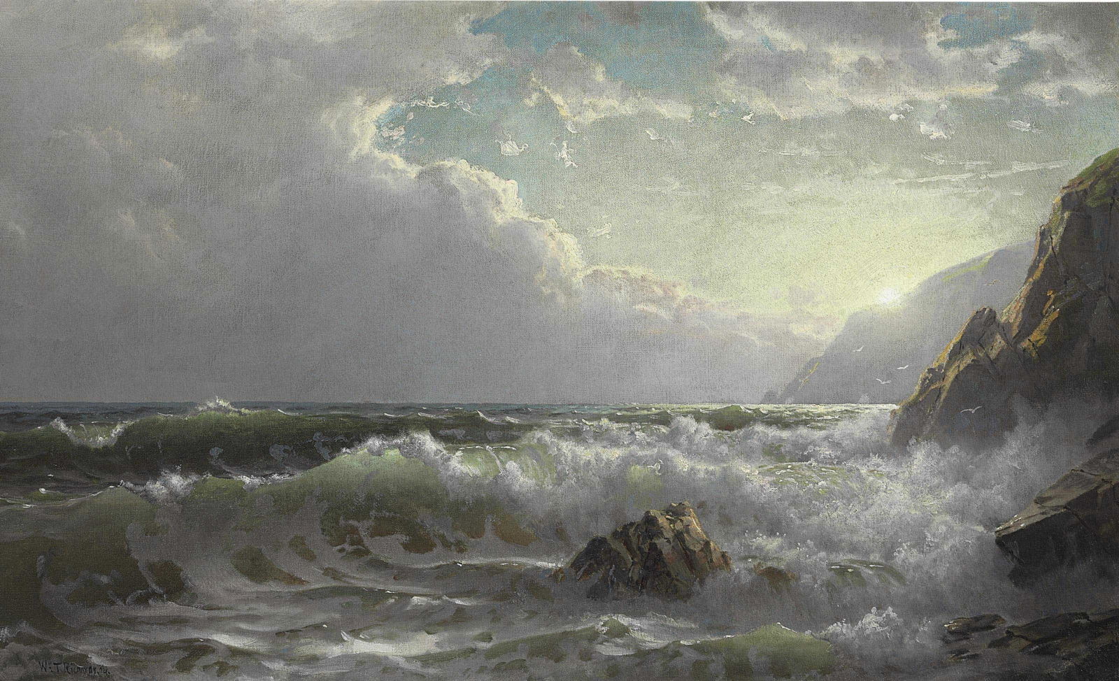 Bierstadt’s wife was diagnosed with ‘consumption’ in 1876, and the following year the couple visited Nassau in the Bahamas, where they hoped the warmer climate would help her condition. During that visit, Bierstadt was inspired to paint The Shore of the Turquoise Sea (1878), showing a wave breaking on the coast there: surely a direct reference to Courbet and Hokusai. Bierstadt also painted a second, larger development from this work after 1878, now exhibited in the Haggin Museum in Stockton, CA, as After a Norther.