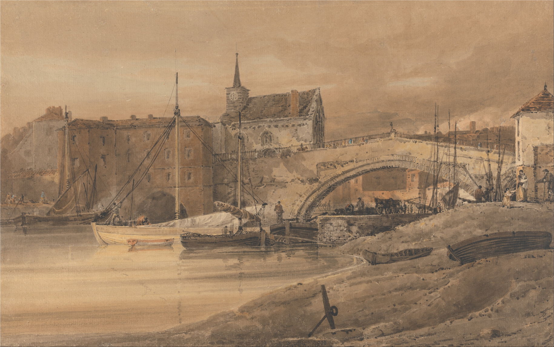 Girtin used a similar compositional approach in his watercolour of Ripon Minster, Yorkshire from 1800, putting the features of the river including its fine bridge in front, to steal the gaze from the bulk of the minster behind.