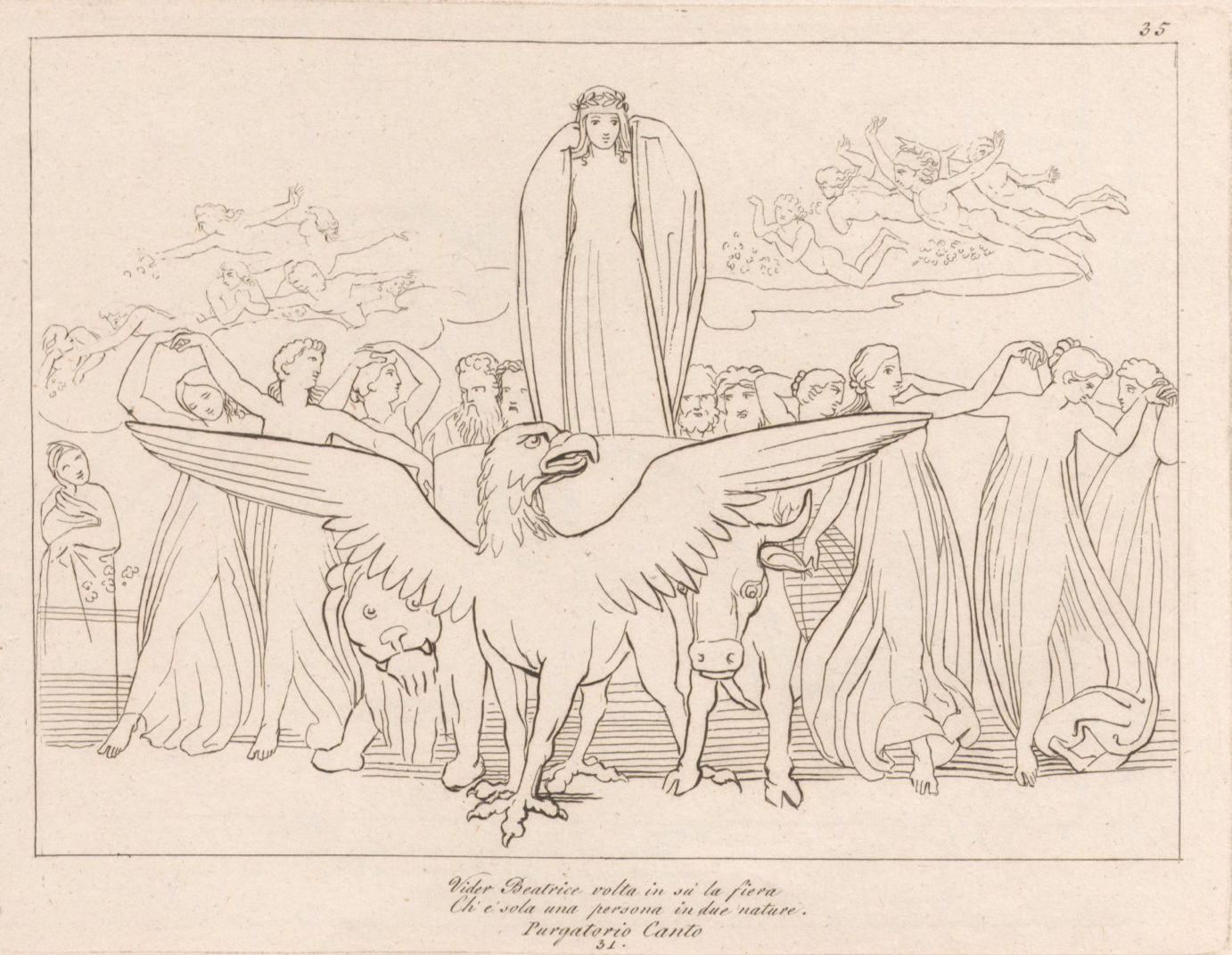 In the middle of that stream of people is a two-wheeled ceremonial chariot being drawn by a Gryphon, whose huge golden aquiline wings stretch out of sight. There’s a clap of thunder, and the procession comes to a halt opposite Dante. He sees the figure of his beloved Beatrice inside the chariot, amid lavish ornamentation and garlands of flowers. She has a white veil, a green robe, and a dress the colour of flame. Their reunion brings him elation, which is quickly dashed when he realises that his companion Virgil has quietly departed.