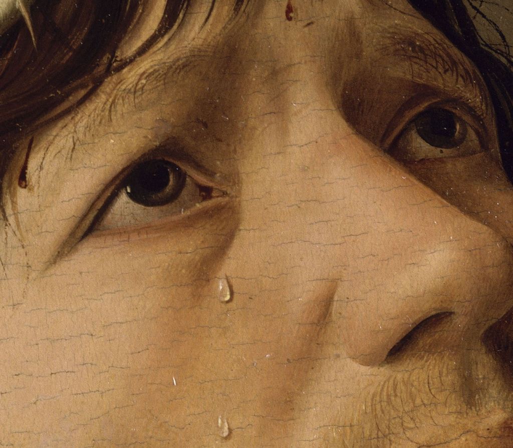 Antonello shows his supreme skill in manipulating oil paint, right down to the two small tears on Christ’s cheek, and the congealed droplet of blood just below the hairline.