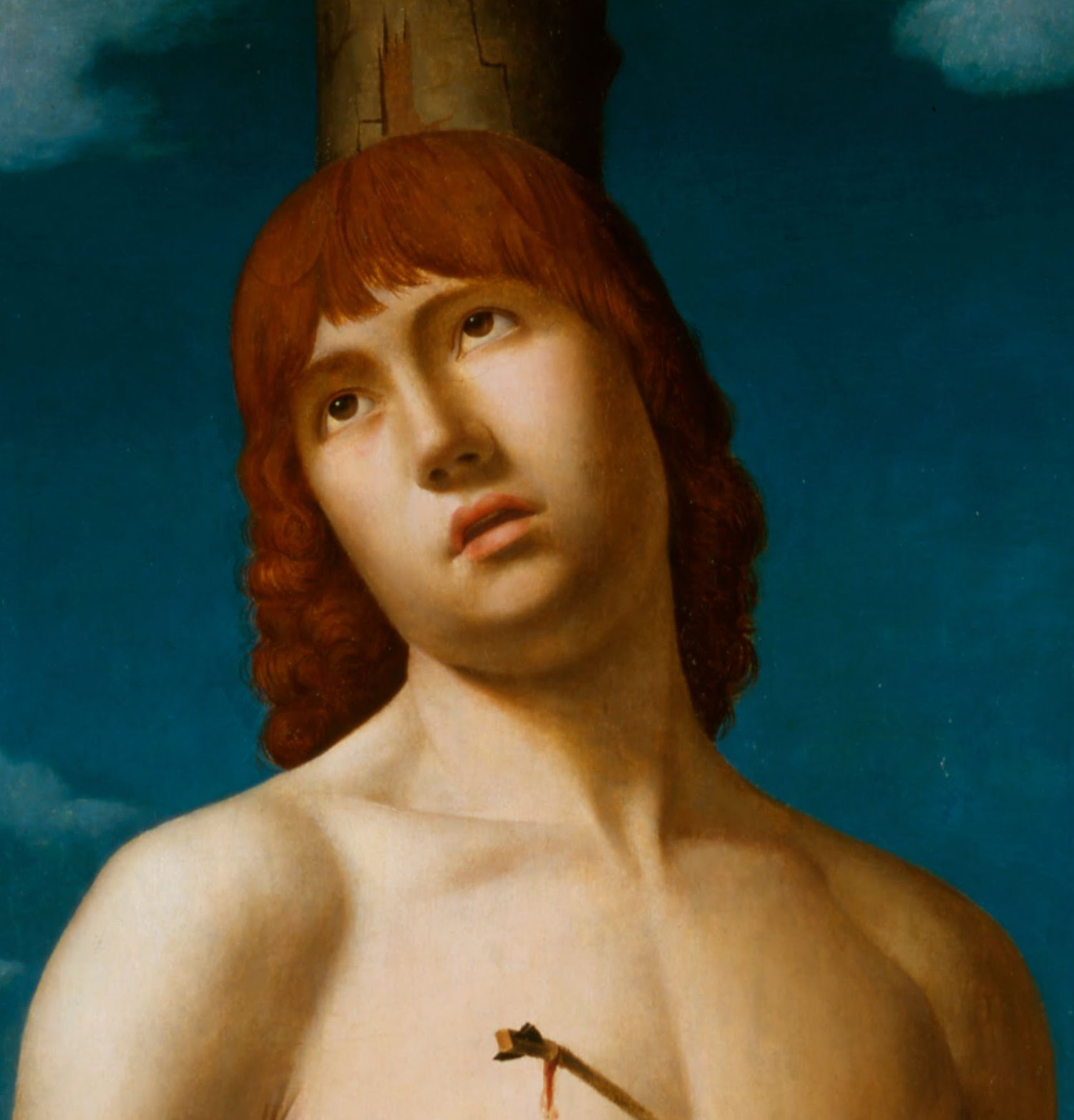 The saint is statuesque in his suffering, tied to an isolated tree trunk in a meticulously-projected piazza. His posture, shoulders in particular, proved of great influence in subsequent Venetian paintings.