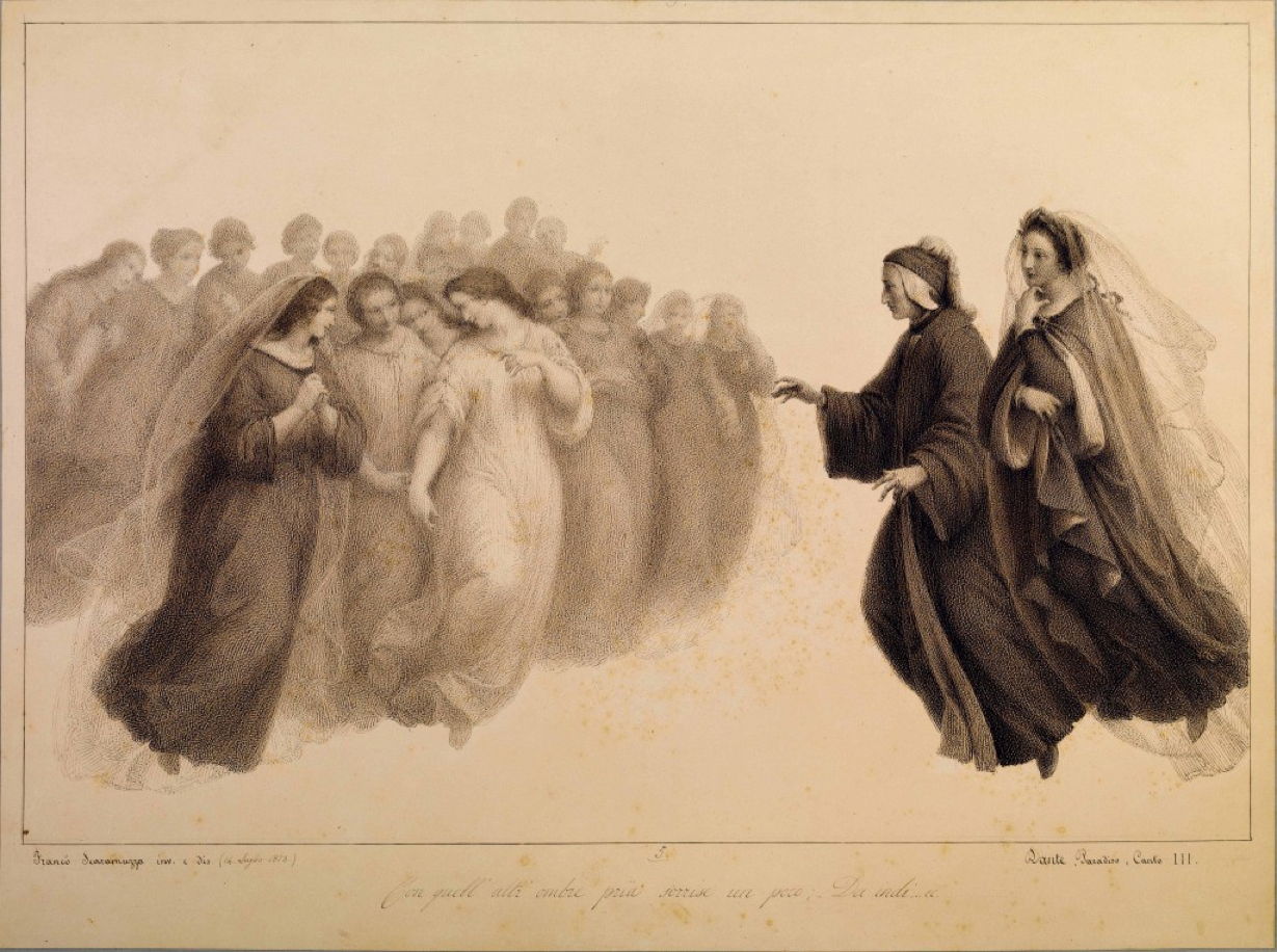 Among these spirits is that of Piccarda Donati, a friend of Dante’s (and related to his wife) whose sister Forese remains in Purgatory for her gluttony, while her brother Corso is condemned to eternal Hell. Piccarda was a member of the order of ‘Poor Clares’, founded by a follower of Saint Francis of Assisi. Her brother Corso forced her to leave her convent near Florence in order to marry one of his colleagues in crime. Piccarda died shortly after that marriage.