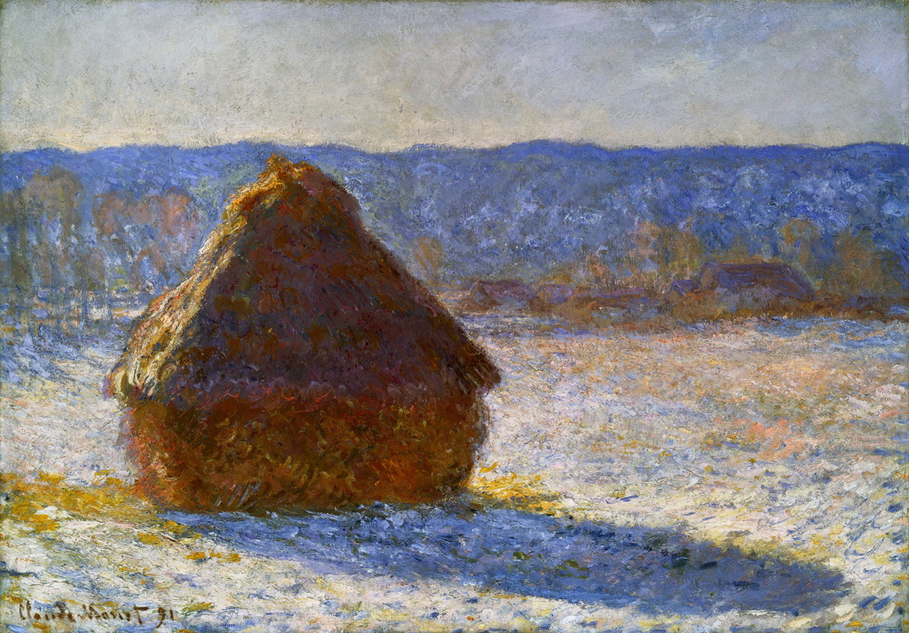 Claude Monet first painted a series of canvases depicting grainstacks at Giverny – literally outside his back yard – in 1889. In the early autumn of 1890, Monet started a fresh series consisting of two grainstacks, now accorded Wildenstein numbers of W1266 to W1279. During that winter, the farmer was able to start threshing, and one of the grainstacks was consumed.