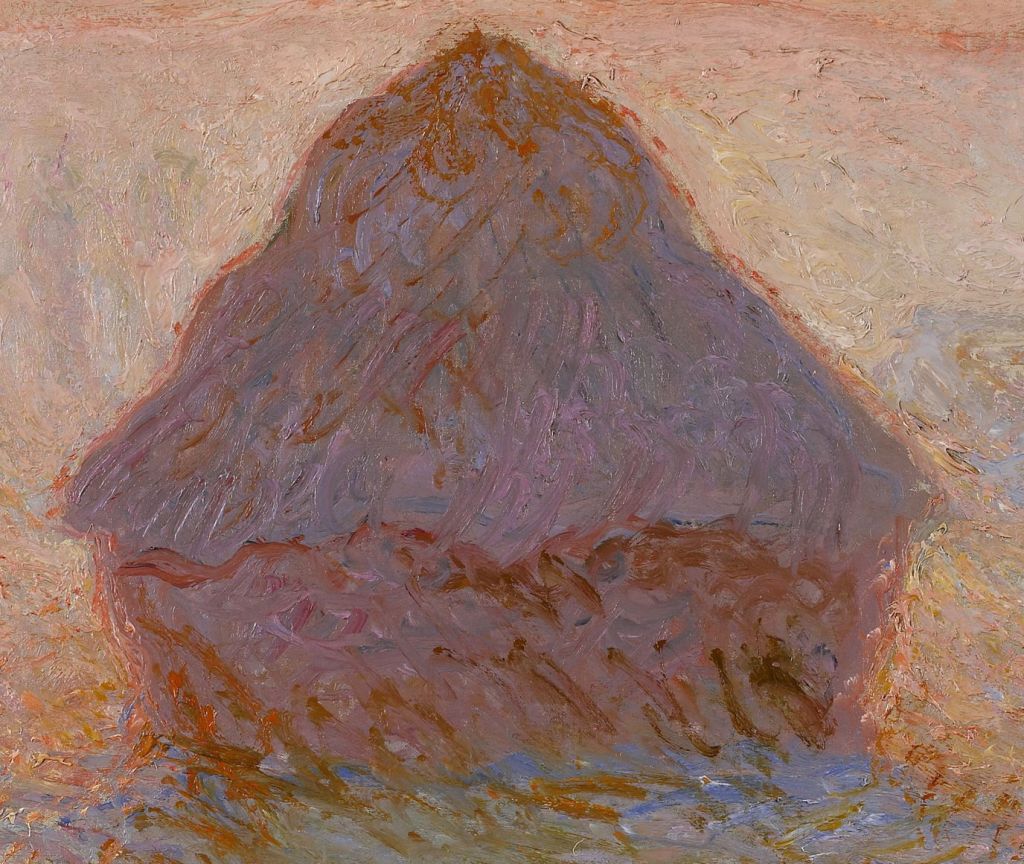 Grainstack, Sun in the Mist, numbered 1286, is thought to be one of the later paintings in the series, apparently showing the sole remaining grainstack in the Spring of 1891. It too has multiple layers applied wet-on-dry, with many hatched brushstrokes in shades of orange and pink apparently applied over a well-dried surface. These are again shown well in the detail (below) of the grainstack itself.