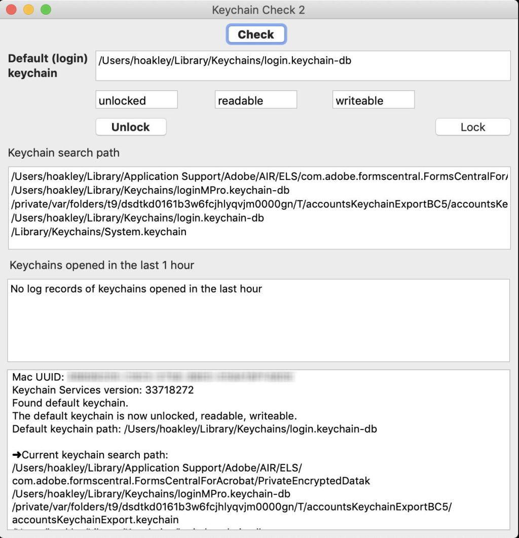Back in the halcyon days of Sierra, I developed what was going to be the start of a more powerful tool, derived from my first utility KeychainCheck. Version 2 provides a lot more information, and (in some circumstances) can even tell you when your keychains are being accessed. It does that by getting an extract from the unified log.