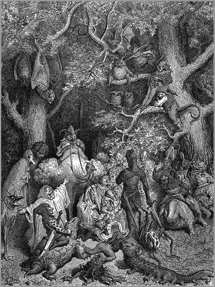 Ruggiero leads the hippogriff on foot, rather than risk taking flight on its back, and follows the path to avoid Alcina. As this climbs inland, he sees Alcina’s fortified city, which glitters with gold. He keeps well away from that, but is soon confronted by a band of hideously contorted creatures riding all manner of animals and birds, brandishing a range of improvised weapons. Their leader sits astride a turtle, and appears drunk.