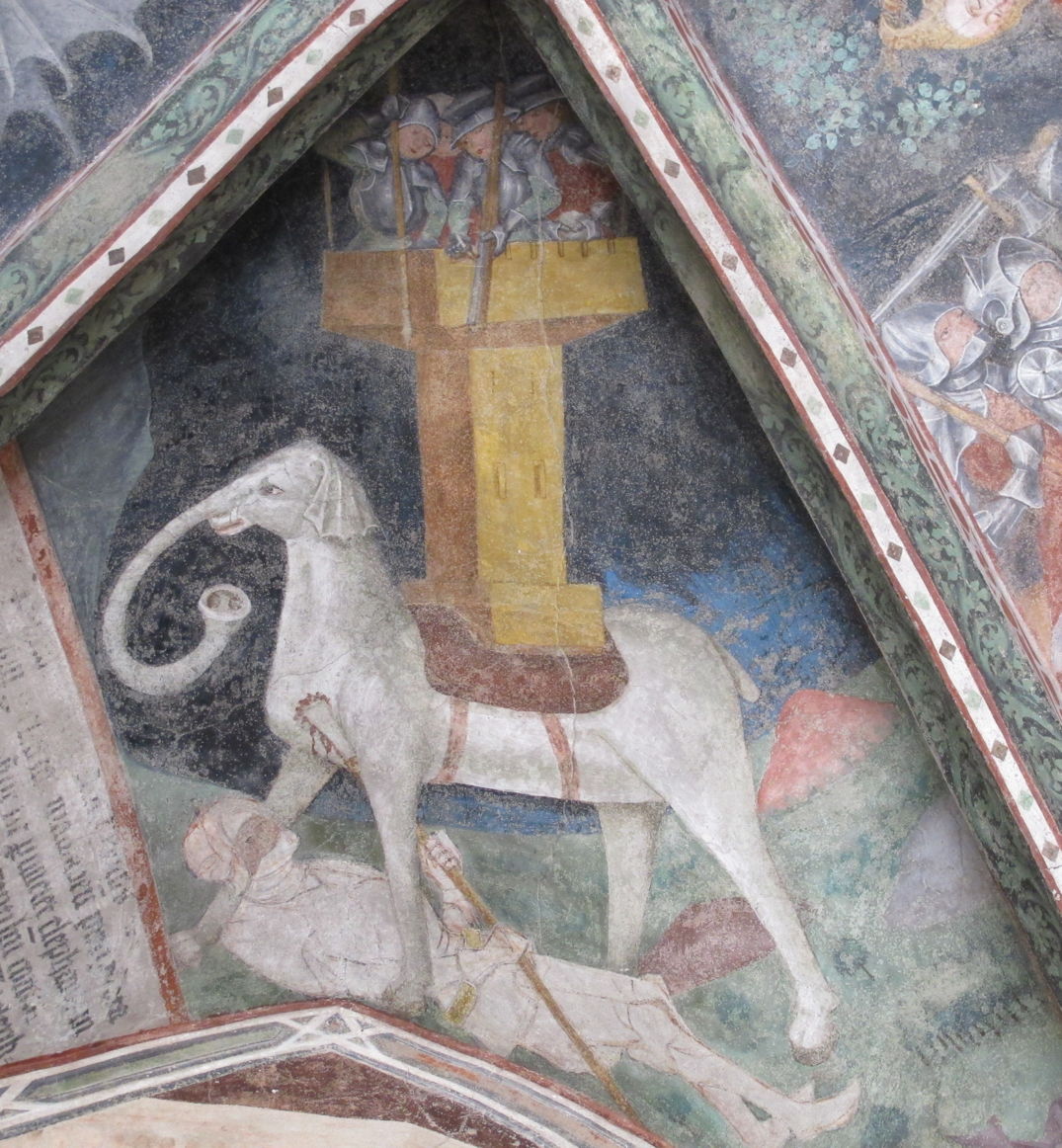 Images of elephants used in combat are quite widespread. This anonymous and undated fresco of a War Elephant in Bressanone Cathedral, in the South Tyrol of Italy, also suggests the origin of the placename the Elephant and Castle, which remains not uncommon among British pubs. The most famous of these, near Waterloo in south London, may have been established before 1600.