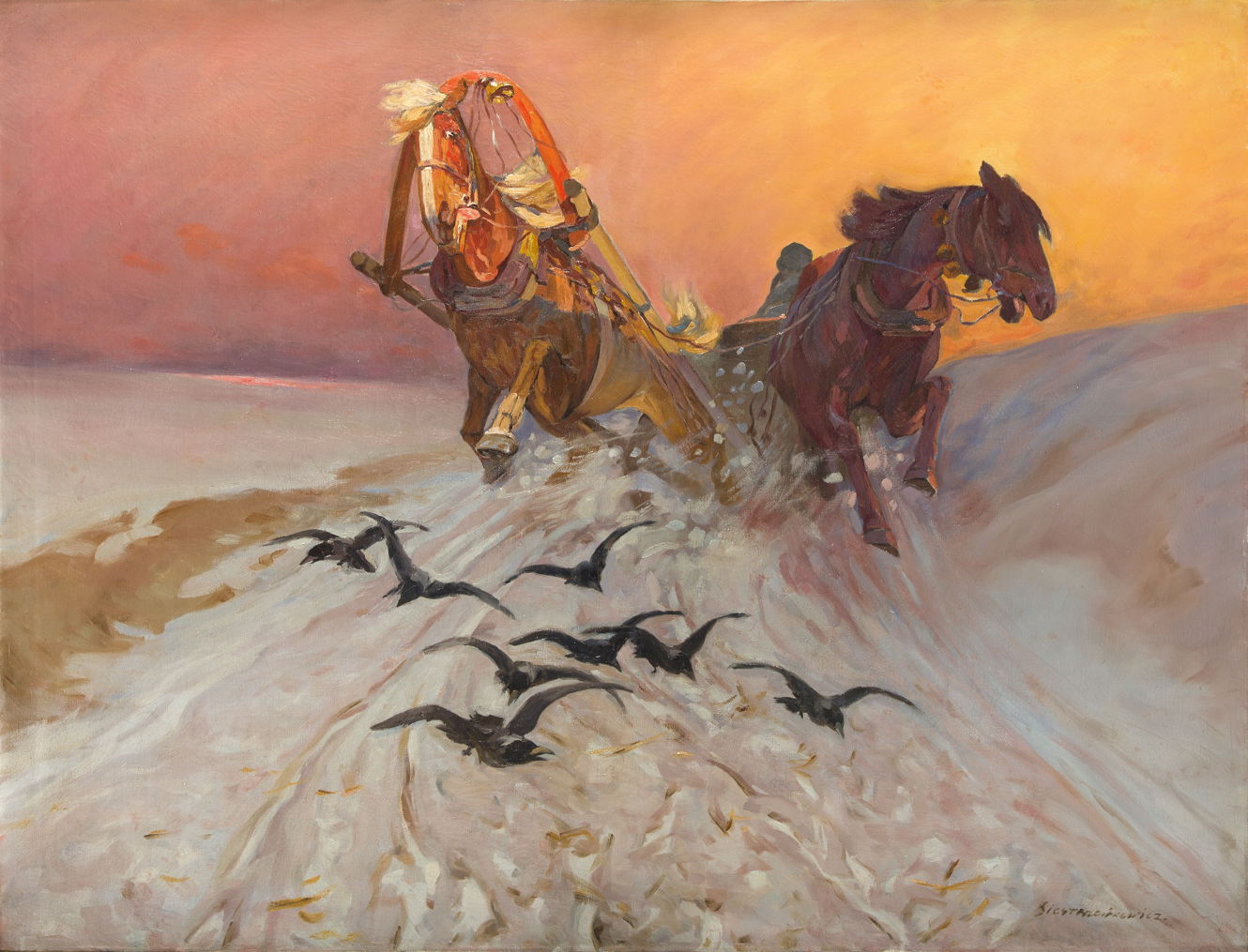 There’s also something distinctly sinister about the birds in Stanislaw Siestrzencewicz’s Crows Before the Sleigh from about 1900, where they’re spooking the horses. Could death be just around the next corner?