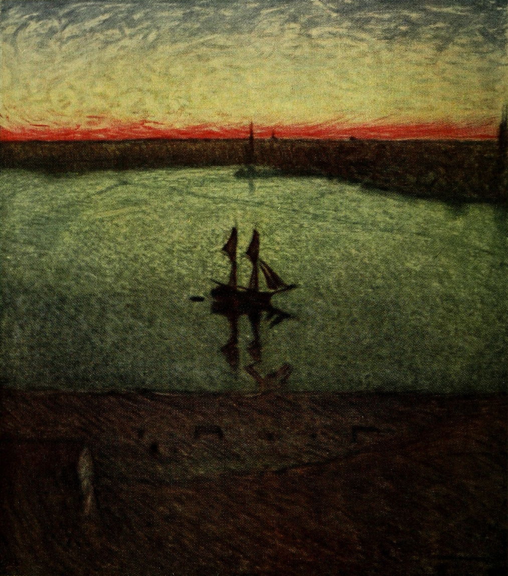 Midsummer Night at Riddarholmen shows a sailing ship anchored in the Riddarfjärden, just below Jansson’s studio, and is perhaps his painting which is most strongly suggestive of influence from Edvard Munch’s Despair-Scream series, with its blood red sky just above the horizon.