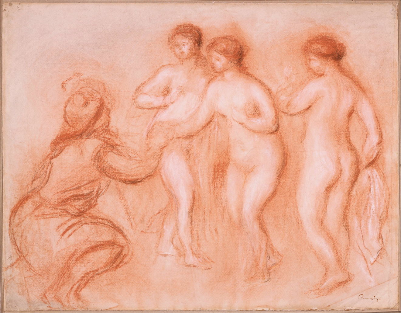 Few of Renoir’s drawings and preparatory sketches have survived, mostly because he discarded them, using many for lighting the stove, for instance. This fine chalk sketch was made primarily for compositional purposes, for the finished painting below. It contains just the thee nude women with Paris presenting the golden apple to the middle of the three.