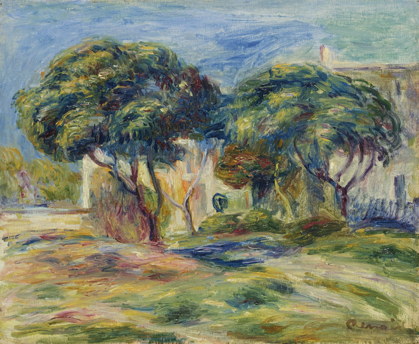 Renoir is thought to have painted this more structured sketch of Maison de la Poste, Cagnes in about 1907, with its unusually fine strokes of contrasting colour in the foliage of the trees and shrubs.