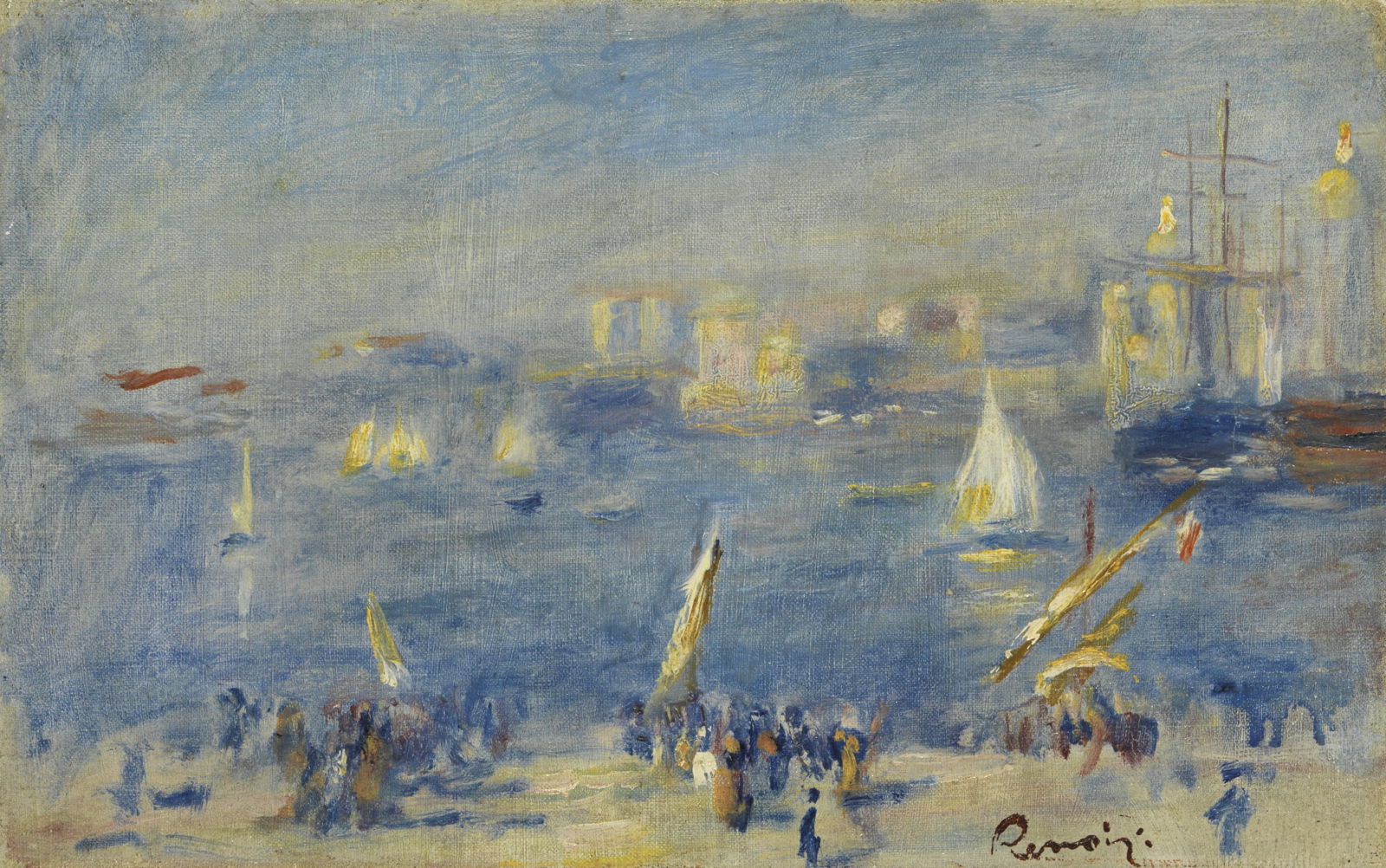Although he was close to the coast, and later could be driven out by his chauffeur, Renoir seems to have painted marine landscapes more seldom than in the past, for example during his visits to the north coast and Guernsey. The Port of Marseille, Fort Saint-Jean from 1906 is a marvellously loose oil sketch of crowds at the waterside and yachts, on a fine and sunny day at Marseille, just along the coast.