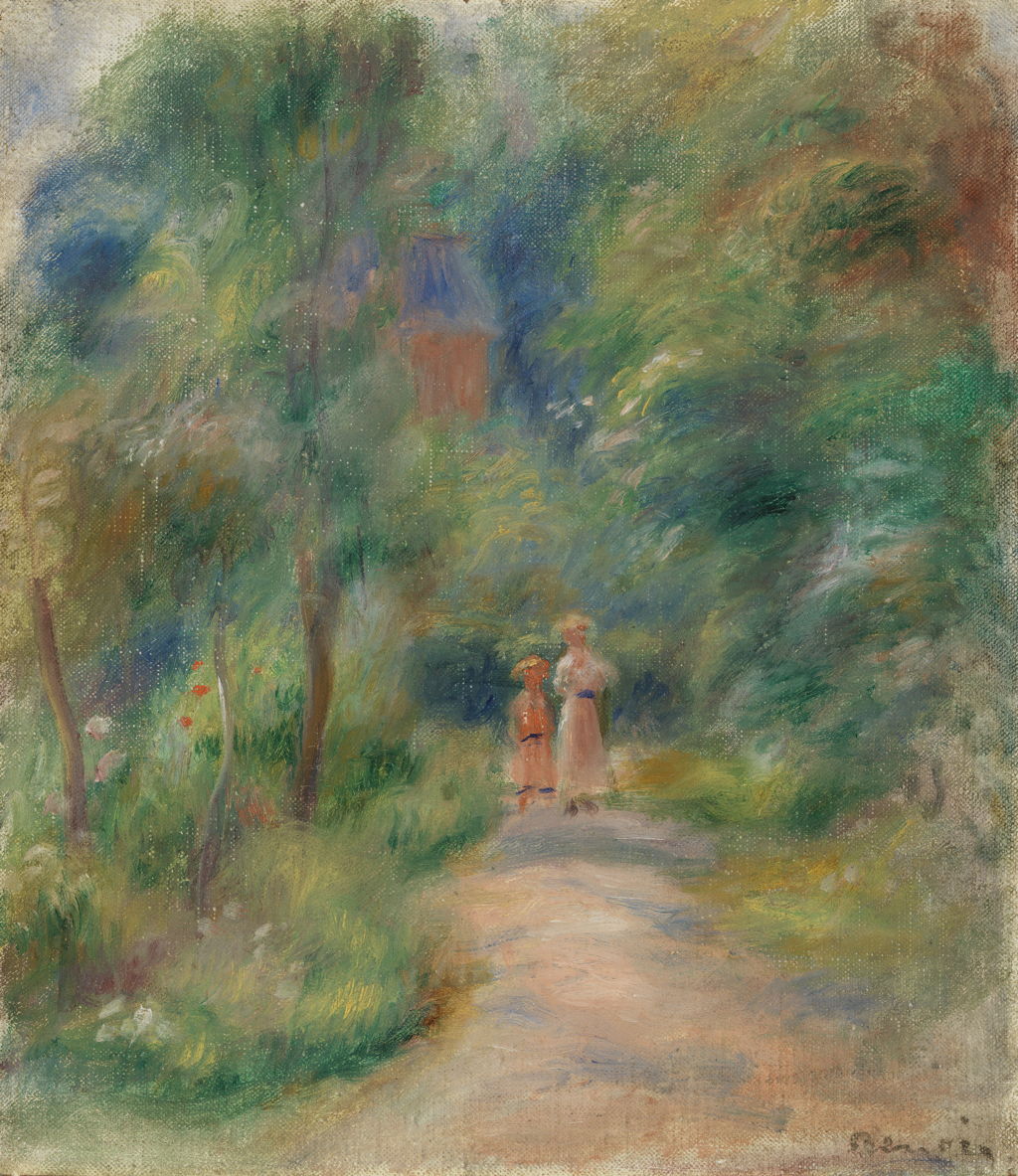 In Two Figures on a Path from about 1906, the figures are now staffage amid wild and wispy foliage which threatens to engulf them completely. Renoir continues to paint in thin layers, with the lightness of touch of a watercolourist.